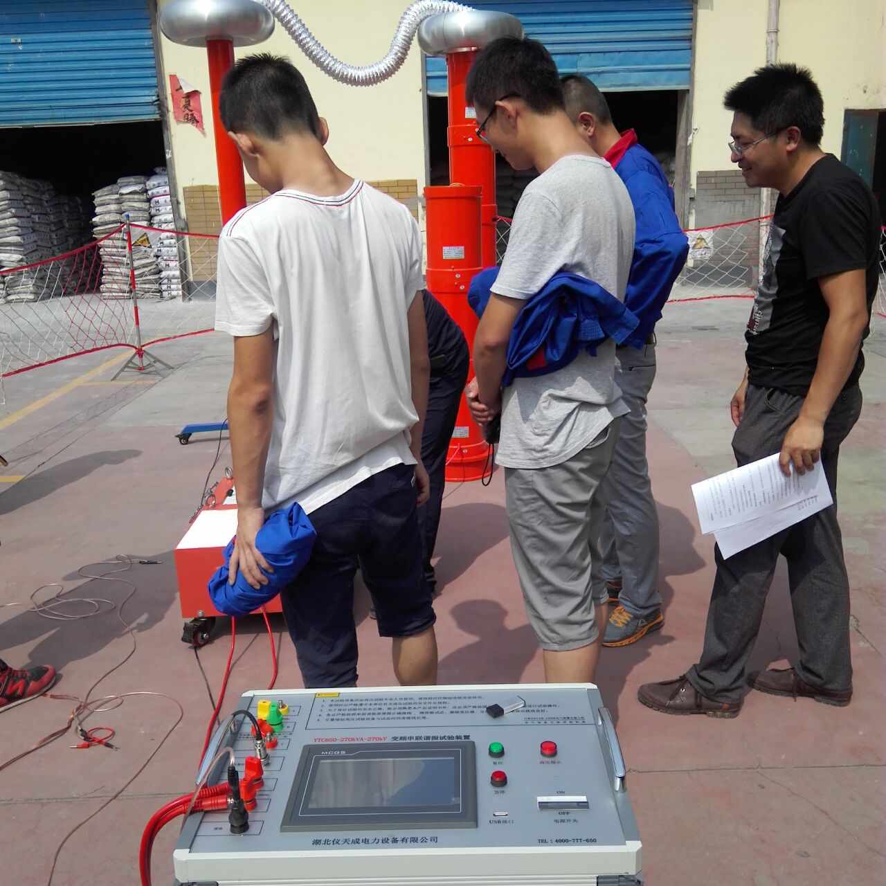 李工很快抵達(dá)現(xiàn)場,與客戶進(jìn)行面對面的交流,了解客戶的需求和想法。然后開始講解設(shè)備,并認(rèn)真講解怎樣安全操作設(shè)備。確保客戶明白了安全操作以后,李工帶領(lǐng)客戶一起做試驗(yàn)——YTC850-270kVA/270kV變頻串聯(lián)諧振試驗(yàn)裝置,YTCDG-1000A大電流發(fā)生器 這2套設(shè)備,其中這套變頻串聯(lián)諧振試驗(yàn)裝置我公司的該設(shè)備為專利產(chǎn)品,諧振電源調(diào)頻及功率元件使用先進(jìn)的日本進(jìn)口的優(yōu)質(zhì)元器件,設(shè)計(jì)的是諧振式濾波電路,能改善輸出電壓的波形畸變,獲得很好的正弦波形,有效的防止了諧波峰值對試品的誤擊穿。變頻電源保護(hù)功能強(qiáng),穩(wěn)定性好;具備具備全自動(自動調(diào)諧、自動升壓)、全手動(手動調(diào)諧、手動升壓)以及半自動(自動調(diào)諧、手動升壓及手動調(diào)諧、自動升壓)的多種工作模式,可任意切換使用;操作方便。