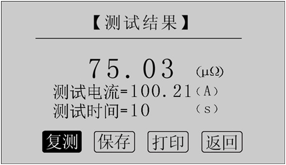 讀取測試結(jié)果,正在測試時,系統(tǒng)顯示“停止”,“返回”項。點擊“停止”,系統(tǒng)停止計時,電流停止輸出。點擊“返回”,系統(tǒng)停止計時,電流停止輸出并返回上一界面。注意:開始測試的前幾秒,由于電流沖擊和電容充電,測試結(jié)果不穩(wěn)定,5s后測試結(jié)果穩(wěn)定,用戶即可記錄數(shù)據(jù)。