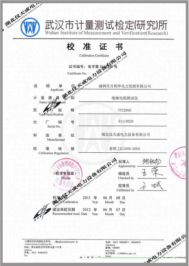 轉載:"YTC2000智能雙顯絕緣電阻測試儀鑒定證書" 請注明來源于儀天成電力。 更多技術問題請致電儀天成電力客戶服務:027-87876585,技術部專線:027-87876585,在線客服:719388481